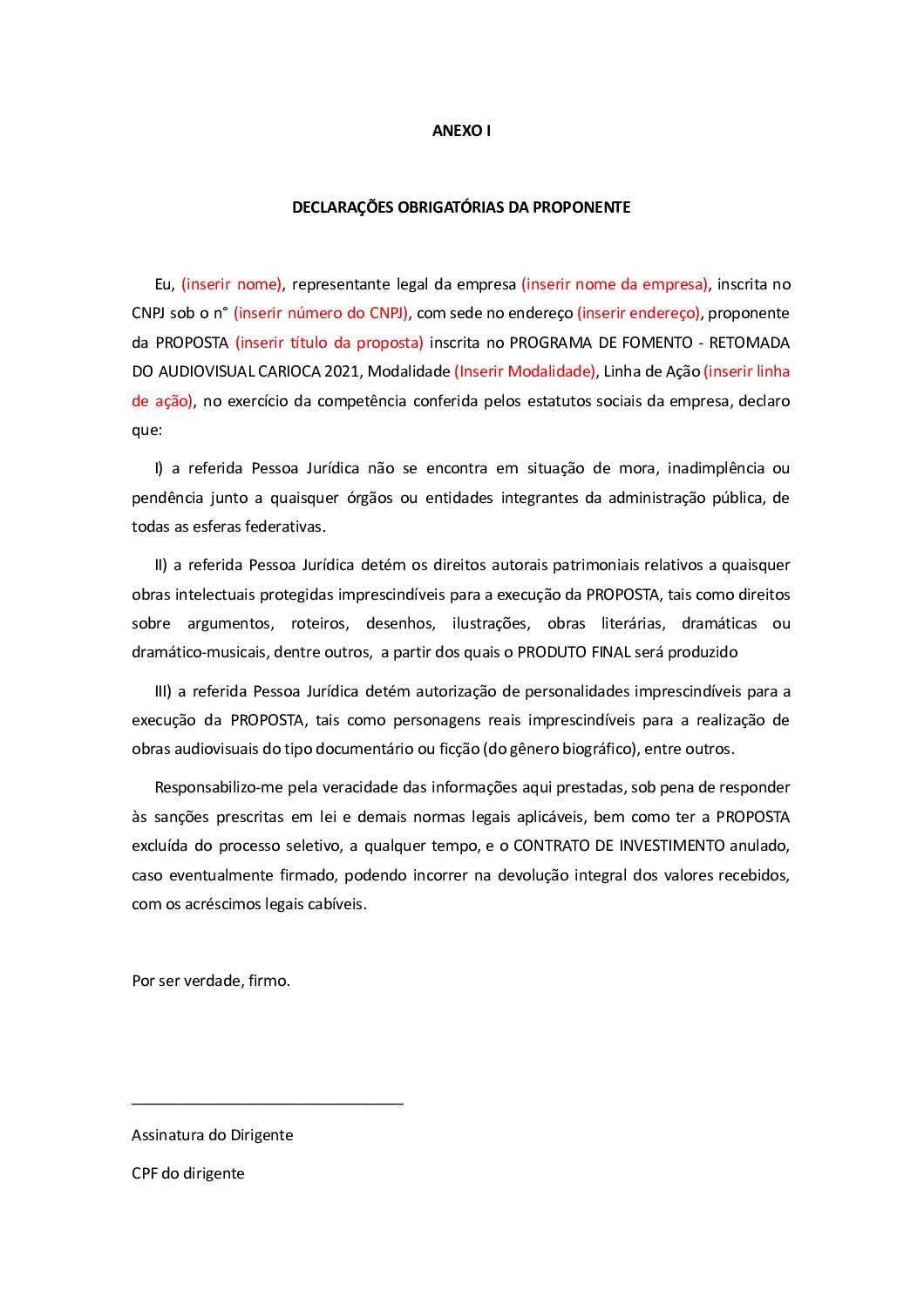 ANEXO I – DECLARAÇÕES OBRIGATÓRIAS DA PROPONENTE