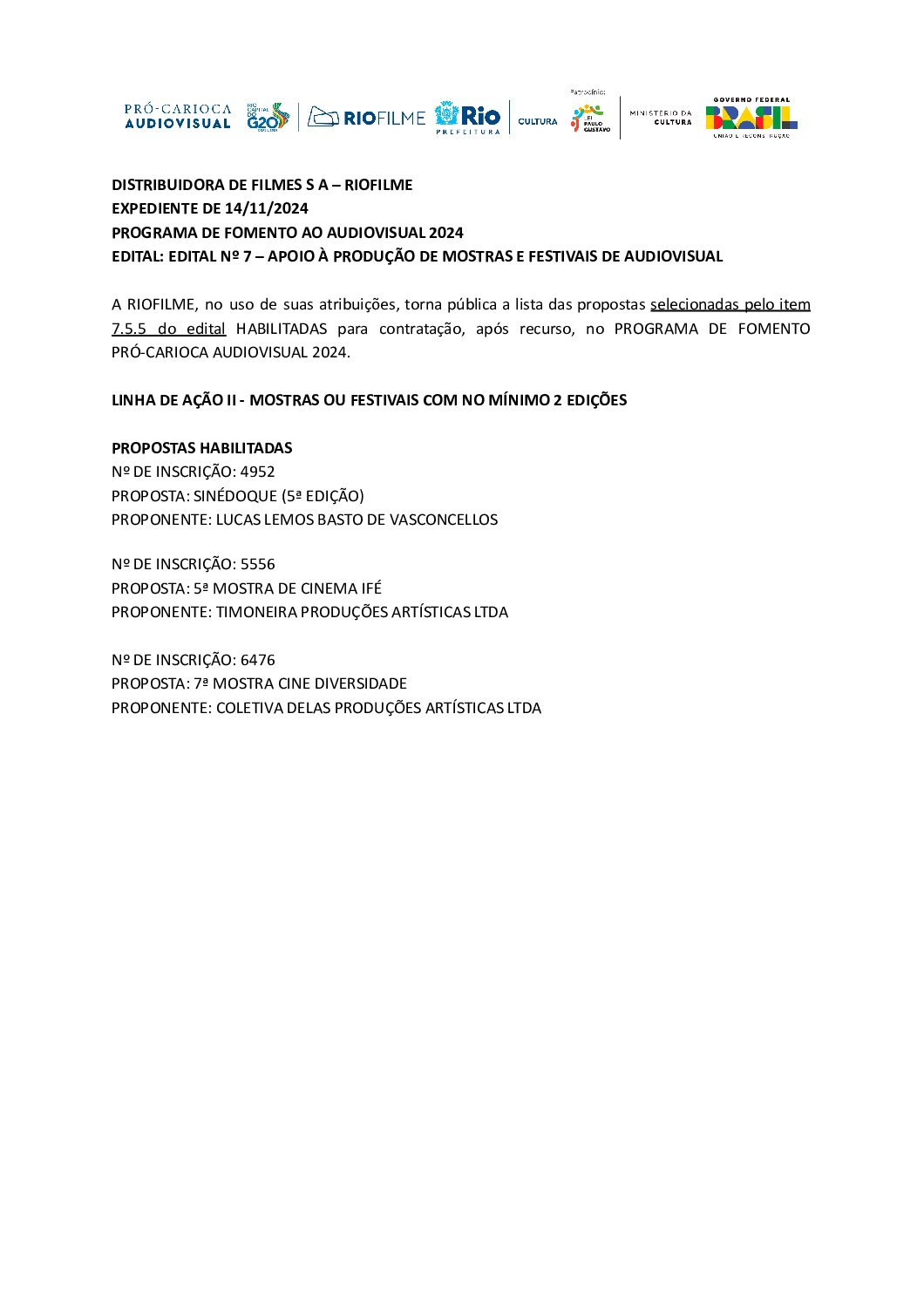 HABILITAÇÃO PARA CONTRATAÇÃO APÓS RECURSO – 7.5.5 – MOSTRAS E FESTIVAIS – 14 de novembro de 2024